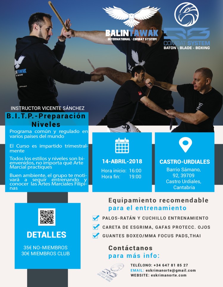 1º curso de Preparación de Niveles de Balintawak Cuentada Publicado poreskrimanorte12 enero, 201818 marzo, 2018Publicado en B3, BALINTAWAK CUENTADA, ESKRIMA NORTEEtiquetas:Arnis, B3 Combat System, Balintawak, Balintawak B3, Balintawak cuentada, Bobby Taboada, Cuentada, Eskrima, eskrima norte, instructores, kali, Richard Cotterill, vicente sanchez Primer curso para la Preparación de los Niveles en Balintawak Cuentada, si estás interesado, no te pierdas la oportunidad de llevar a cabo una formación seria y continua… «De Corazón, Sois Bienvenidos, Con Respeto» Comparte esto: Haz clic para compartir en X (Se abre en una ventana nueva) X Haz clic para compartir en Facebook (Se abre en una ventana nueva) Facebook Haz clic para enviar un enlace por correo electrónico a un amigo (Se abre en una ventana nueva) Correo electrónico Haz clic para compartir en WhatsApp (Se abre en una ventana nueva) WhatsApp Me gusta Cargando... Relacionado