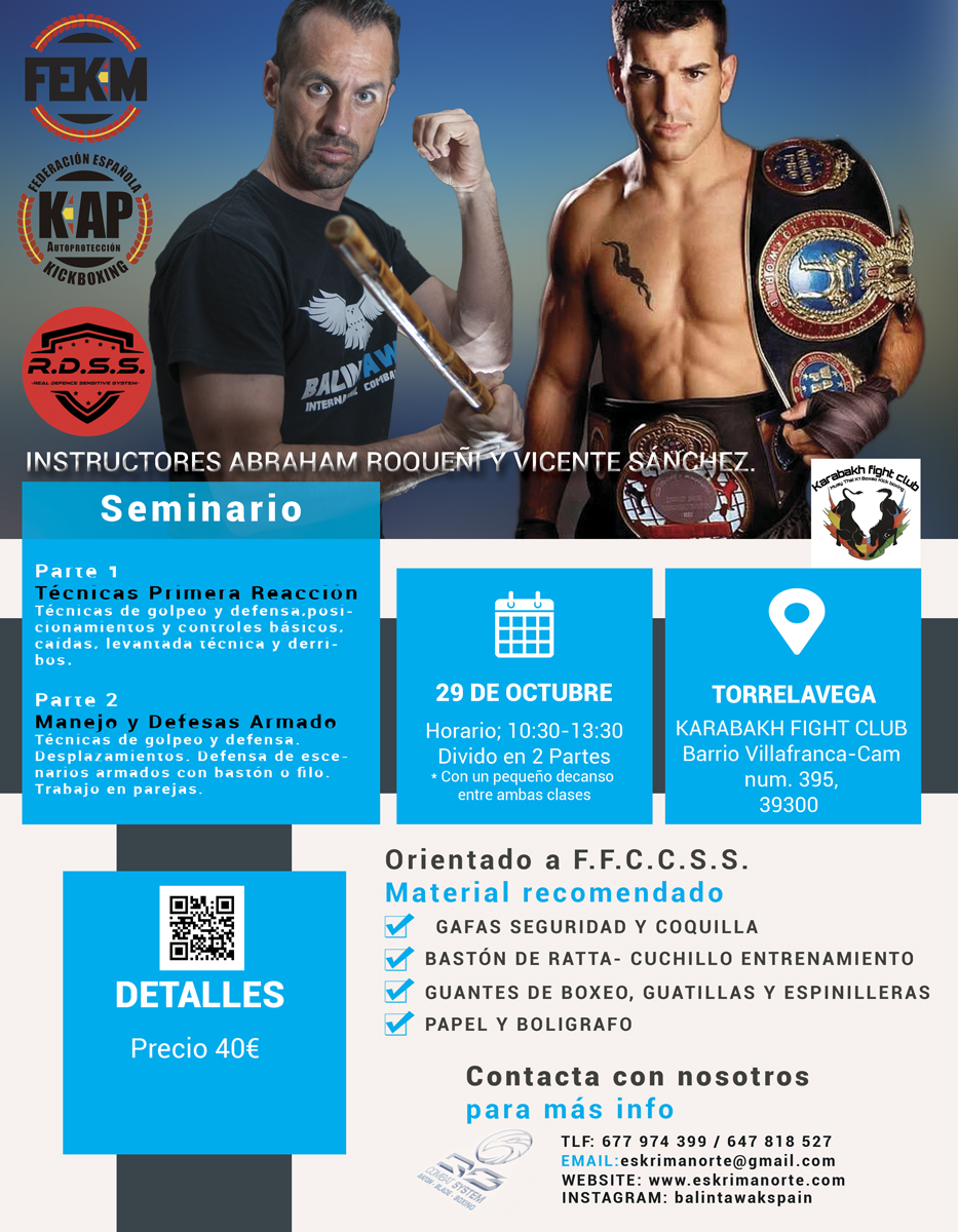 El próximo 29 de octubre llevaremos a cabo un seminario orientado al mundo de la Defensa Personal y Defensa Personal Policial de la mano de Abraham Roqueñi y Vicente Sanchez en el gimnasio Karabakh en Torrelavega.