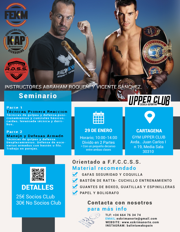 El próximo 29 de Enero realizaremos un seminario de R.D.S.S. y K.A.P. de defensa personal y defensa personal policial impartido por los instructores Abraham Roqueñi y Vicente Sanchez en la localidad de Cartagena. Para más información contactar os dejo el cartel del mismo.