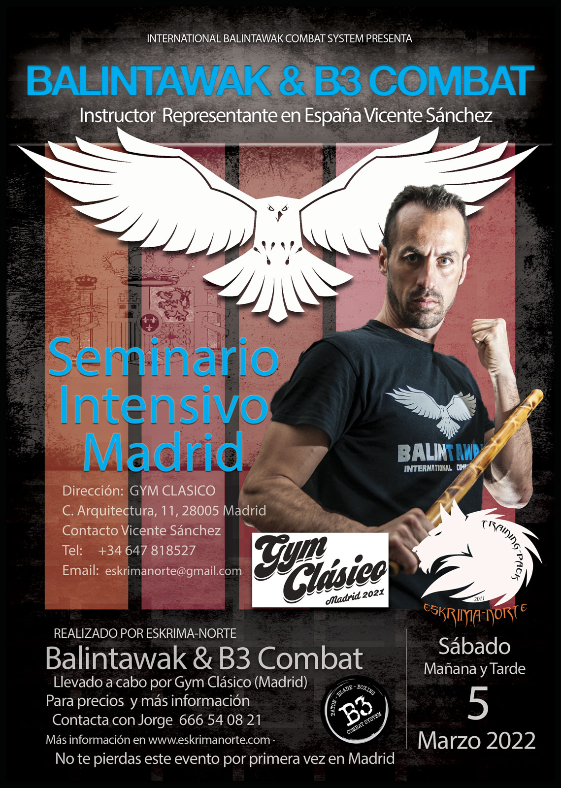 El próximo 5 de marzo nos trasladamos a Madrid al gimnasio GYM CLASICO para llevar a cabo un intensivo de mañana y tarde en el que mostraremos un poco del trabajo que realizamos en nuestro equipo de Balintawak Cuentada y B3 Combat System. Para más info os dejo el cartel y el contacto para poderSigue leyendo "SEMINARIO INTENSIVO EN MADRID"